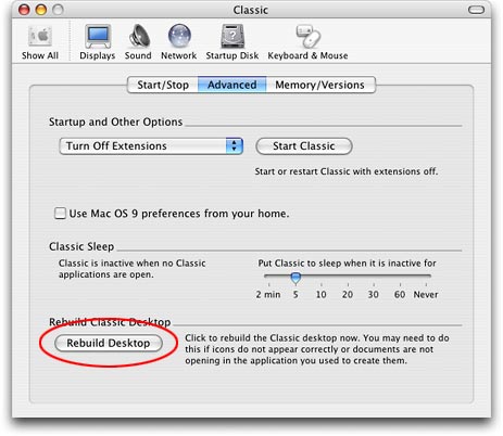Now, it's easier than ever. Just go under the Apple menu, choose System Preferences, and click on the Classic icon. When its pane appears, click on the Advanced tab, and the advanced features pane will appear with a Rebuild Desktop button (at the bottom of the pane). Just click it, and it does its thing. You don't even have to restart Classic just click the button. In fact, you don't even have to launch Classic to rebuild the desktop.